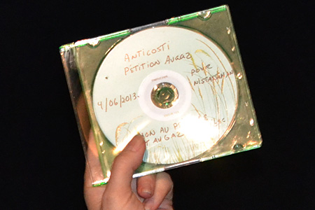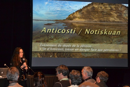 Remise de la pétition: Remise de la pétition au député Amir Khadir, Québec Solidaire, qui a accepté de la transmettre pour nous aux différents chefs de partis à l’Assemblée nationale du Québec. Remise par Marie-Hélène Parant (groupe Non au Pétrole et au Gaz) initiatrice de la pétition avec Ioan Corriveau, groupe Anticosti que faire.